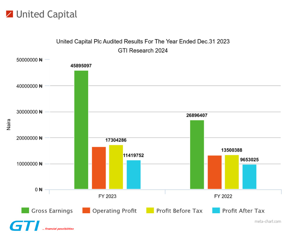 The United Capital Group grew Gross earnings by 71% year-on-year to N45.90 billion, profit before tax increased by 28% year-on-year to N17.30 billion, profit after tax rose by 18% year-on-year to N11.42 billion, total assets grew by 55% year-on-year to N931.95 billion.